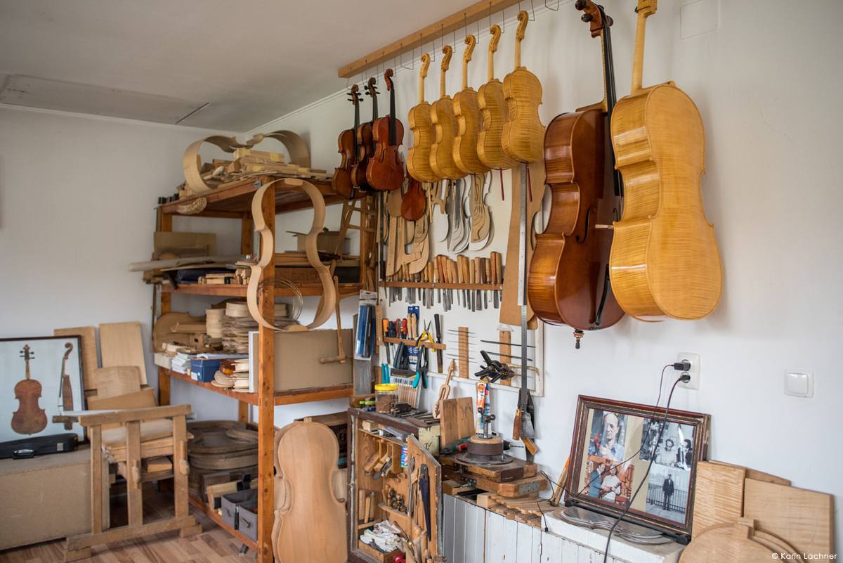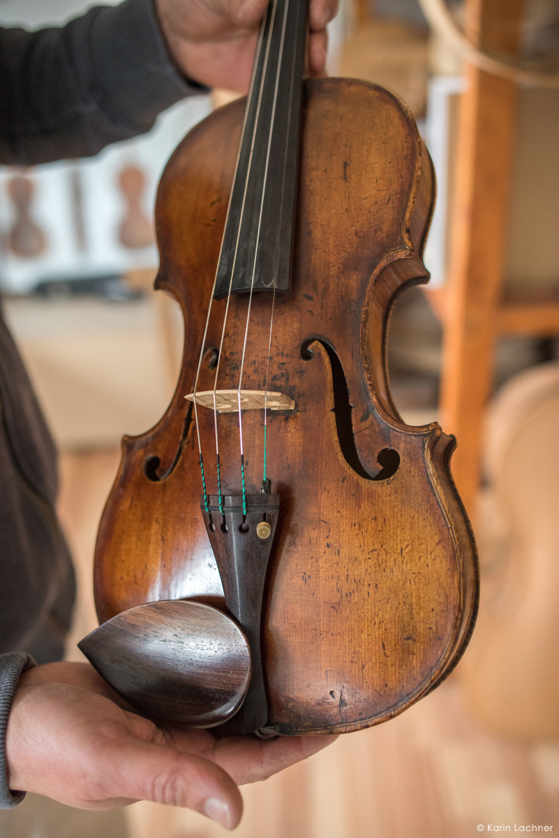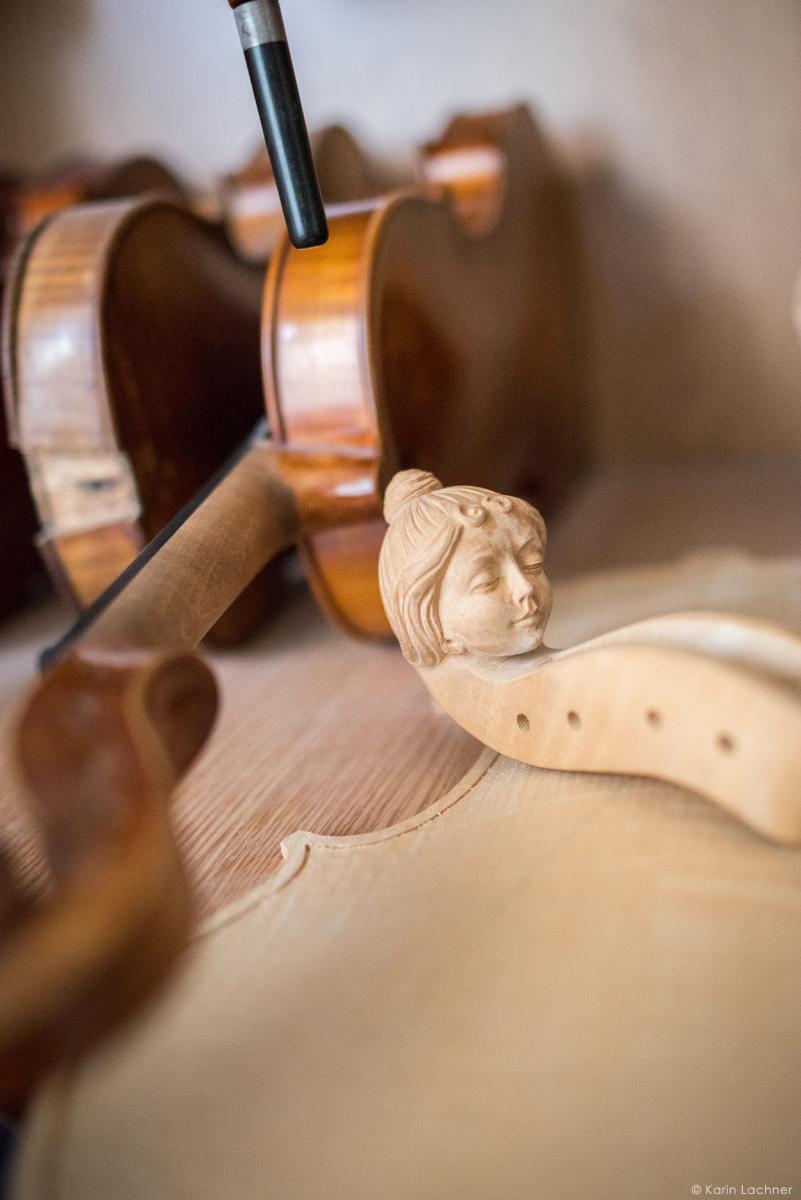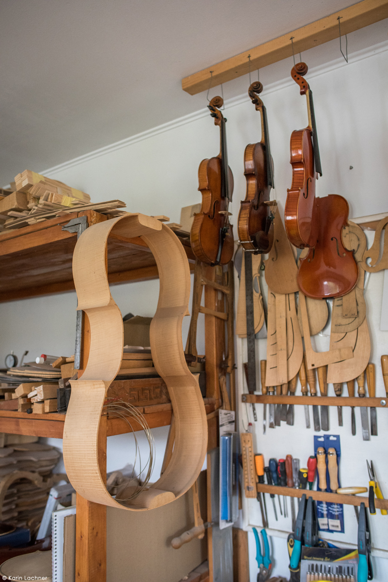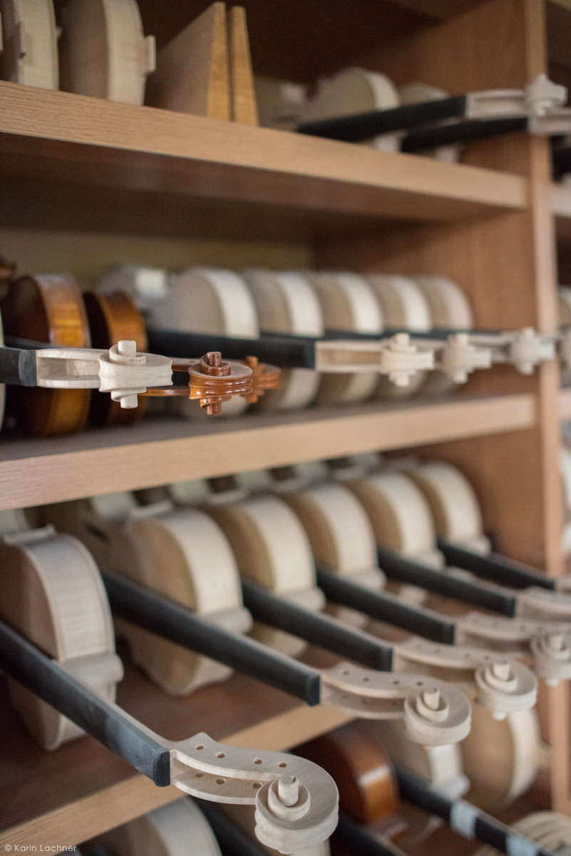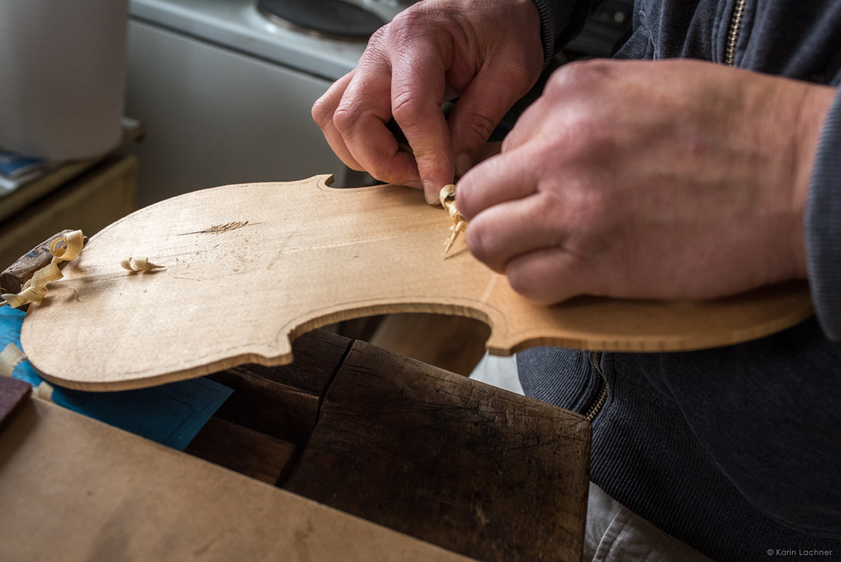 Lutierul caută un anume fel de paltin şi anume paltinul creț, un copac ce produce o rezonanţă muzicală deosebită. Ciocănind fiecare trunchi de copac, lutierul ştie să il asculte şi să găsească copacul în care se ascunde muzica unei viori. Copacii potriviți trebuie tăiați în lunile noiembrie-decembrie pentru ca lemnul sa fie mai dens si mai rezistent. Acest tip de lemn este utilizat pentru spatele viorii ce este realizat din două bucăți şlefuite manual şi lustruite cu migală de către lutier urmând ca acestea să fie îmbinate cu clei de oase.